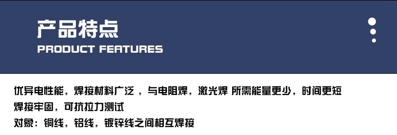 3、焊接材料广泛性:针对于非金属和大部分同异种金属相互焊接,有着极强的广泛性,铜与铝线,铜与镀锌线,铝线与镀锌线等都可以进行焊接。